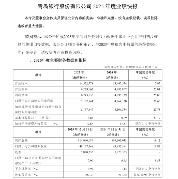 1月28日,青岛银行披露了2025年度业绩快报。数据显示,2025年该行实现营业收入145.73亿元,同比增长7.97%;归母净利润51.88亿元,同比增长21.66%;基本每股收益0.85元。