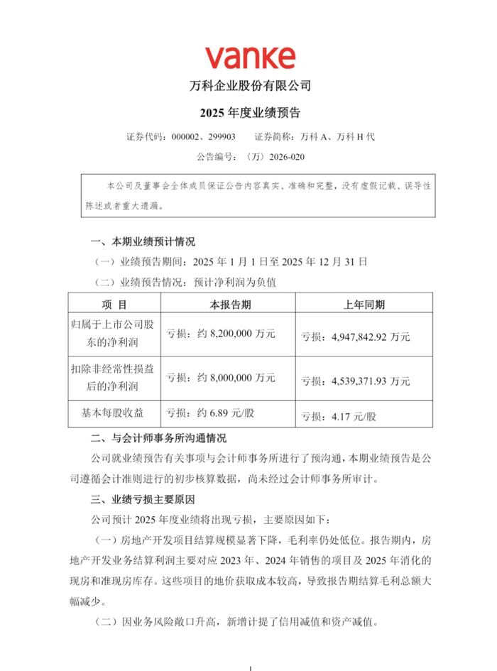 近日,万科企业股份有限公司披露2025年度业绩预告,预计全年归属于上市公司股东净亏损约820亿元,扣非净亏损约800亿元,基本每股收益亏损6.89元。