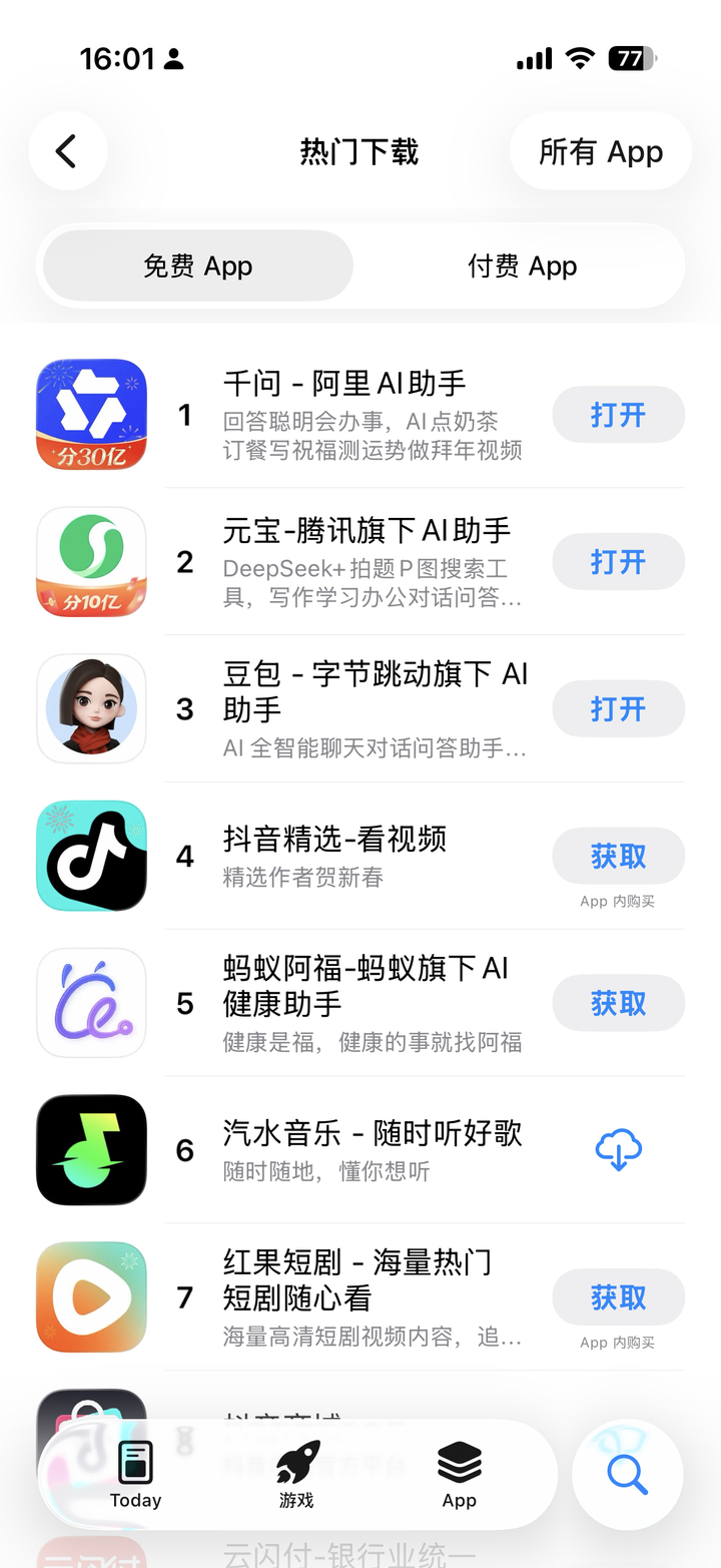 2月6日下午,苹果App Store免费榜迎来戏剧性反转。阿里千问APP凭借“春节30亿免单”活动的强势发力,上线5小时订单突破500万单,成功反超腾讯元宝、字节豆包,一举登顶榜首,形成千问领跑、元宝紧随、豆包居后的全新竞争格局,也让AI大模型应用赛道的春节营销大战迎来最高潮。
