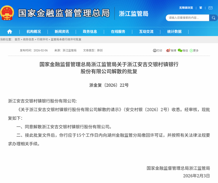2月6日,国家金融监督管理总局浙江监管局发布批复,已于近日同意解散浙江安吉交银村镇银行股份有限公司。此前批复显示,该行业务由交通银行承接并改为支行。