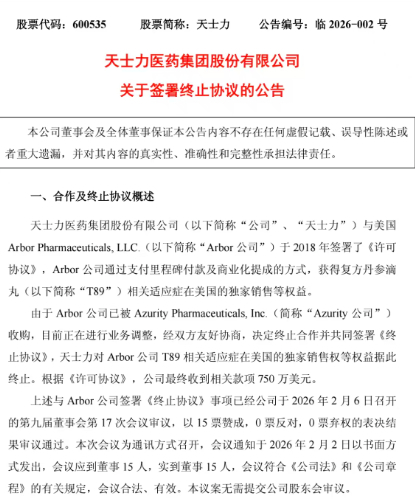 天士力表示,签署《终止协议》并收回T89相关适应证在美国的独家销售等权益,不会对公司项目推进、生产经营及财务状况产生重大影响。