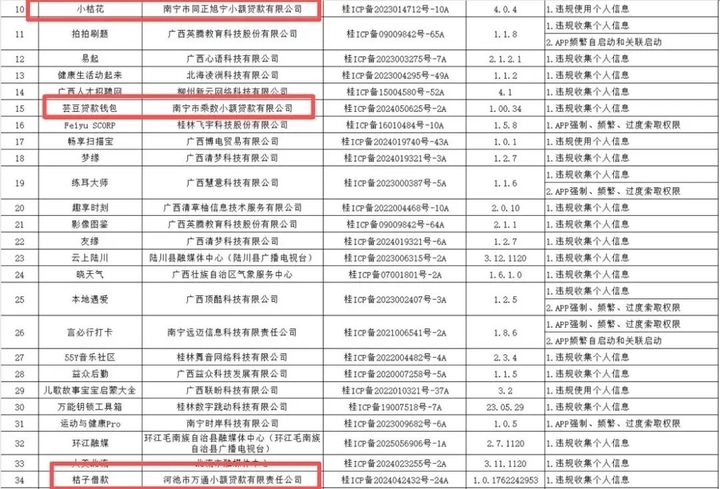 近日,广西通信管理局对40款侵害用户权益行为的App进行通报,其中三家小贷公司旗下App被点名。包括南宁市同正旭宁小额贷款有限公司旗下“小桔花”、南宁市乘数小额贷款有限公司旗下“芸豆贷款钱包”、河池市万通小额贷款有限责任公司旗下“桔子借款”三款App。