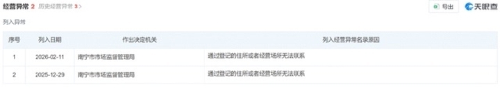 公开信息显示,同正旭宁小贷成立于2013年,注册资本为5000万元。同正旭宁小贷第一大股东为桂林市亿铭贸易有限公司,持股比例20%,其余股东均为个人。天眼查显示,同正旭宁小贷因通过登记的住所或者经营场所无法联系,多次被南宁市市场监督管理局列入经营异常。