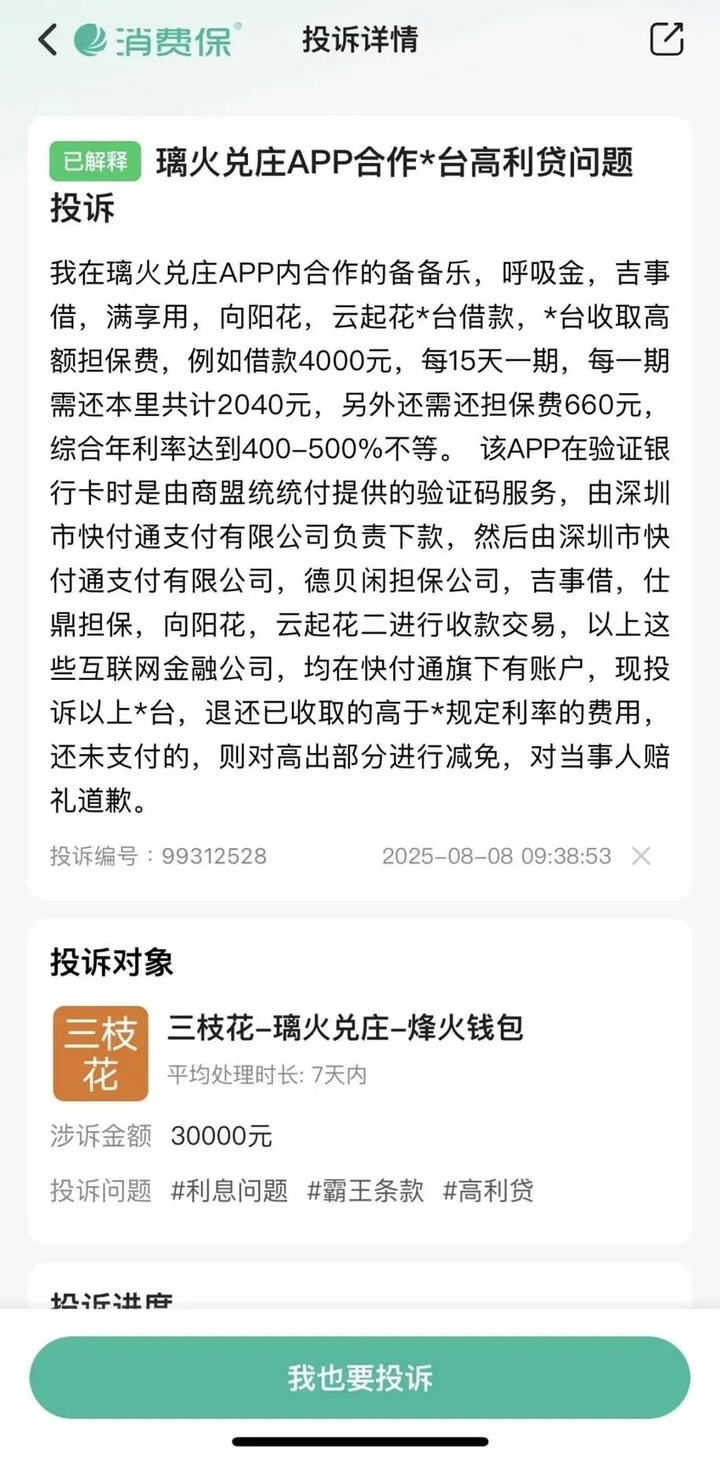 消费保平台显示,璃火兑庄因高额服务费的问题受到多名消费者投诉。一名消费者投诉表示,在璃火兑庄App内合作的备备乐、呼吸金等平台借款,平台收取高额担保费。例如借款4000元,15天1期,分2期还款,本息每期需还2040元,此外每一期还需还担保费660元,综合年化利率较高。