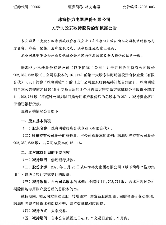 公告显示,第一大股东珠海明骏计划在公告披露之日起15个交易日后的3个月内,通过大宗交易方式减持不超过1.117亿股,占公司剔除回购专用账户后总股本的2%。对于此次减持,公告明确原因为“偿还银行贷款”。若按当日收盘价粗略测算,涉及资金规模超过40亿元。