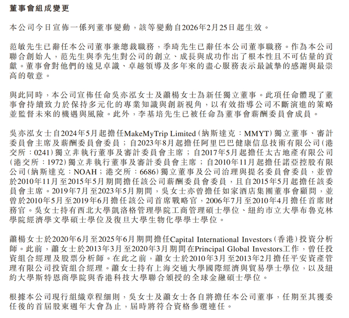 公告显示,范敏辞任公司董事兼总裁,季琦辞任董事 。1999年,两人与梁建章、沈南鹏共同创立携程旅行网。季琦毕业于上海交通大学,创业早期参与搭建携程核心团队与业务模式,2002年离开后相继创立如家、汉庭等酒店品牌。