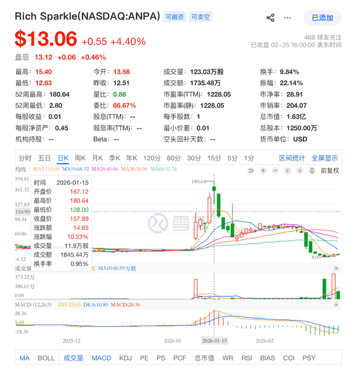 随着“上市”传闻被澄清,市场焦点转向ANPA本身。这家体量并不大的纳斯达克公司,在宣布9.75亿美元并购后股价一度暴涨,又在短时间内大幅回落。情绪退潮之后,估值、整合能力与业绩兑现,成为下一阶段更现实的问题。