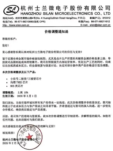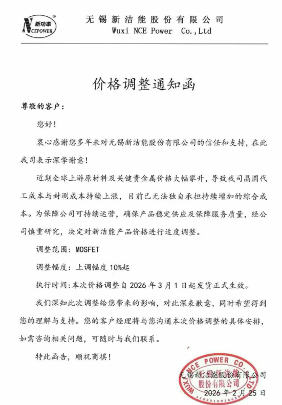 新洁能表示,近期全球上游原材料及关键贵金属价格大幅攀升,导致公司晶圆代工成本与封测成本持续上涨,目前已无法独自承担持续增加的综合成本。为保障公司可持续运营,确保产品稳定供应及保障服务质量,经公司慎重研究,决定对新洁能产品价格进行适度调整。