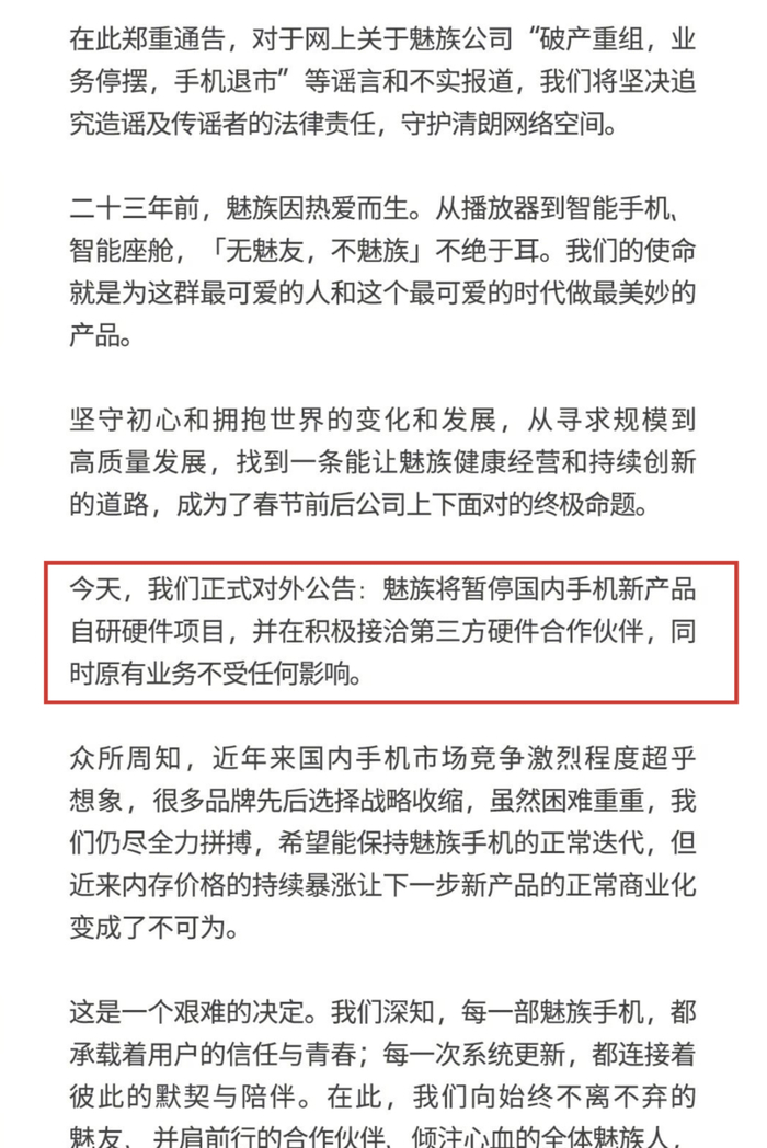 从市场反应来看,公告发布后,行业普遍将其解读为魅族手机时代的正式终结。尽管官方使用“战略转型”“暂停自研”等温和表述,但终止新机型硬件研发、放弃独立手机产品线,意味着魅族彻底退出主流手机战场。