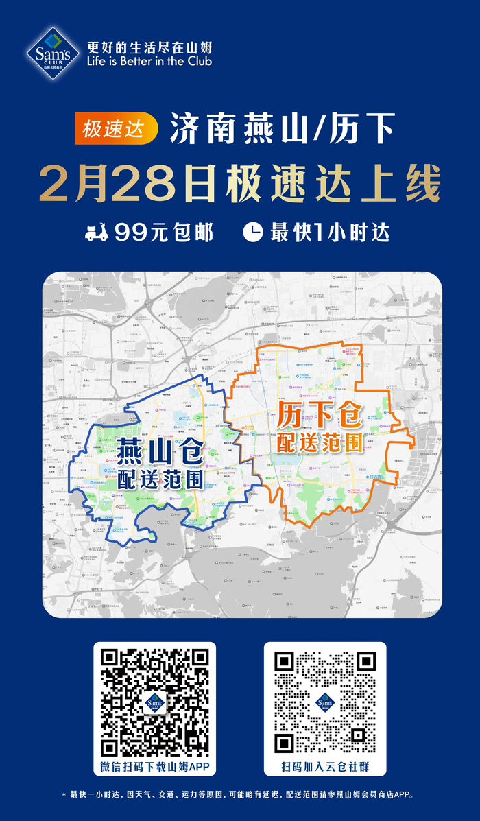 根据官方消息,2月28日起,济南山姆超市燕山仓/历下仓正式上线“极速达”配送服务,会员可使用山姆APP极速达下单,解锁最快1小时线上购物体验。