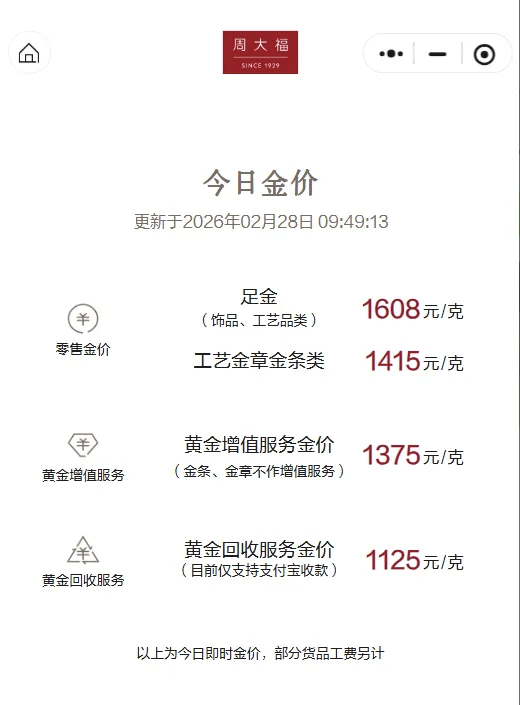 此外,2月27日,中东地缘紧张局势推动市场避险情绪升温,加之美元指数下跌,国际金价上涨。28日,多数金店金饰价格突破1600元/克,其中,周生生报价1602元/克,周大福报价1608元/克,老庙黄金报价1608元/克。