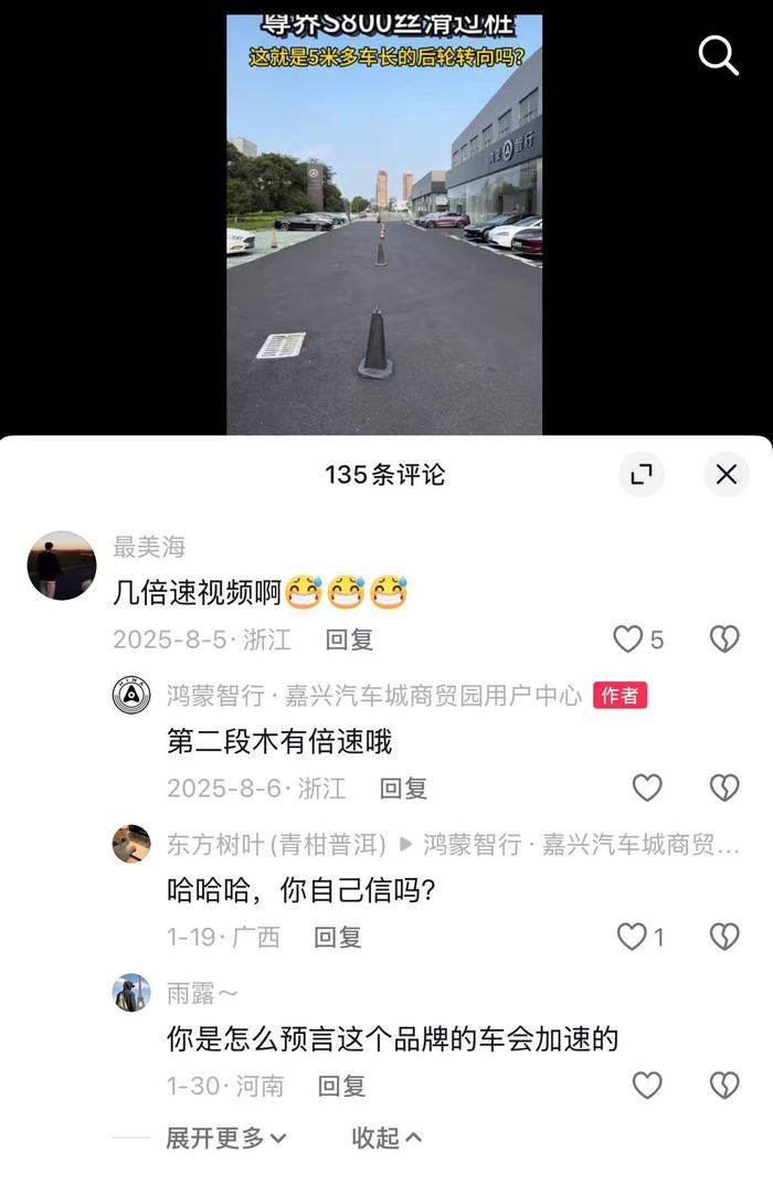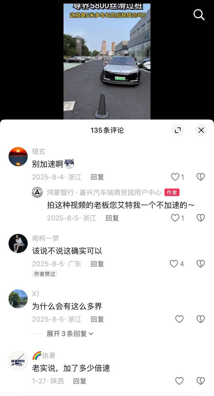 2025年8月4日,“鸿蒙智行·嘉兴汽车城商贸园用户中心”发布了一段尊界S800绕桩视频。面对评论区网友抛出的“几倍速视频”的询问,该官方账号回复称“第二段木有倍速哦”,这一表述被网友解读为默认视频前段存在加速处理。目前,该视频依然可以正常播放,未作修改。