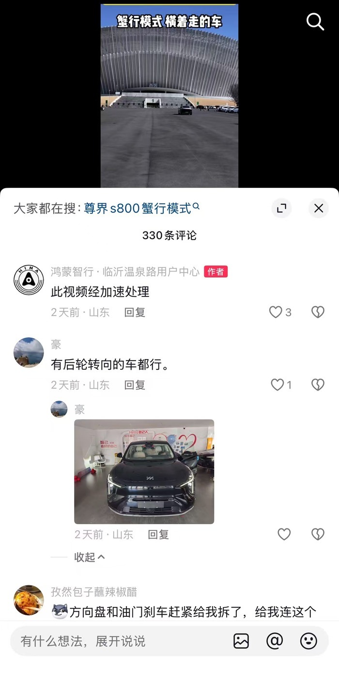 另一家门店则采用了事后补充评论的方式。2月26日,认证为临沂阿里汽车销售服务有限公司的“鸿蒙智行·临沂温泉路用户中心”发布了尊界S800“蟹行模式”演示视频。在引发大量关于加速的讨论后,涉事门店在最初两天保持沉默。直至2月28日,该账号才在评论区的一条回复中补充了“此视频经加速处理”。截至发稿,这条说明评论仅获3个点赞,在数百条互动中并不明显。