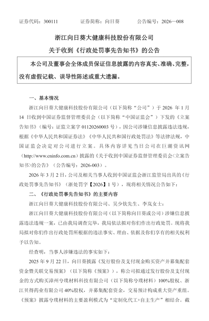3月2日晚间,浙江向日葵大健康科技股份有限公司(300111.SZ,下称“向日葵”)公告收到浙江证监局《行政处罚事先告知书》。