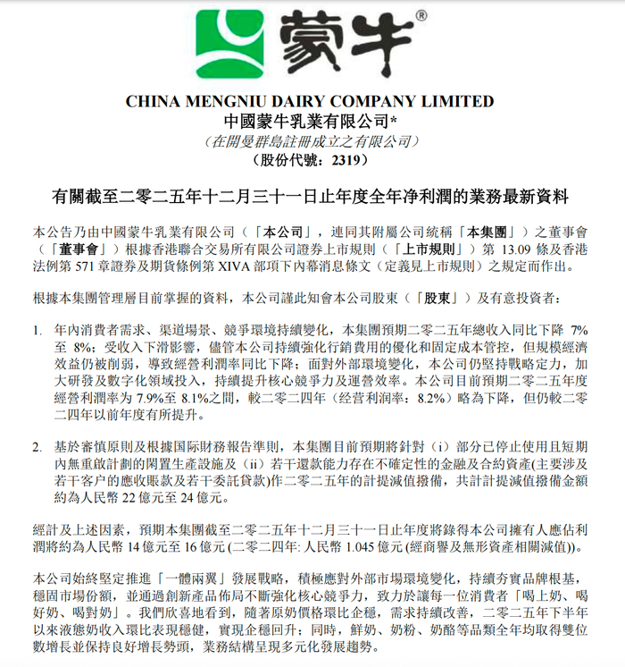 在宏观经济与行业周期交织的背景下,乳业巨头蒙牛乳业正面临一段调整期。3月6日晚,蒙牛乳业有限公司(股份代号:2319.HK)发布关于2025年度全年净利润的业务最新资料。这份尚未经审计的初步评估显示,公司在主营业务收缩、历史资产包袱以及渠道信用管理等方面正承受多重压力。