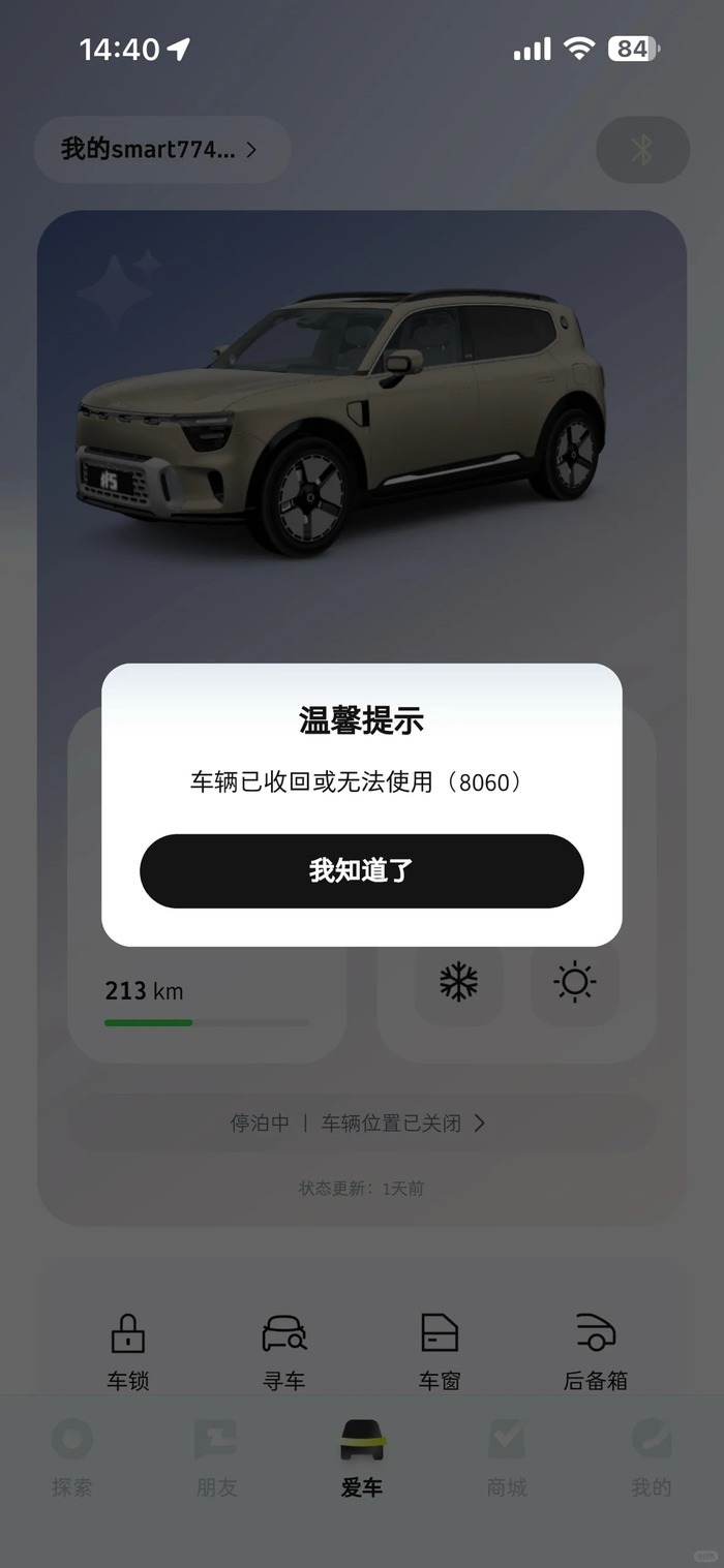 多名车主表示,故障从当天早间开始出现。登录smart官方App时,页面弹出“温馨提示:车辆已收回或无法使用”的提示,并伴随“8006”或“8060”等错误代码。由于提示文案较为敏感,一些车主最初误以为车辆被远程锁定,或账号出现异常。故障时间从9日早晨7点左右,持续至下午。