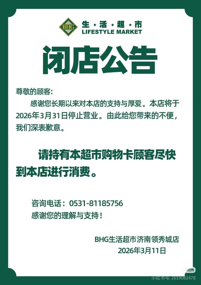 11日下午,北京华联生活超市济南领秀城店公众号连发两则公告表示,该店将于2026年3月31日停止营业。“由此给您带来的不便,我们深表歉意,请持有本超市购物卡顾客尽快到本店进行消费。”