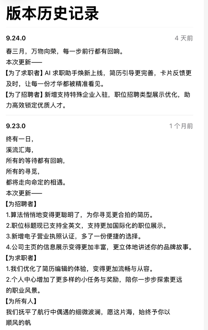 新黄河大鱼财经记者在苹果应用市场看到,鱼泡直聘软件9.23.0版本在一个月前发布,4天前公司上传了9.24.0版本。