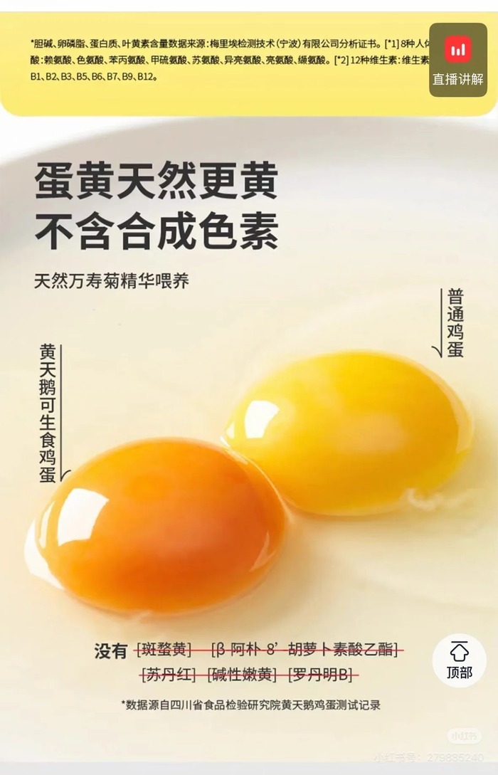 黄天鹅是此次高端鸡蛋检出角黄素风波中,率先作出书面回应的品牌之一。声明从检测结果、色素来源、成本逻辑和生产工艺四个方向提出辩护。然而,围绕批次数据差异、着色剂用途定性以及宣传表述的争议,并未随声明的发布而平息。