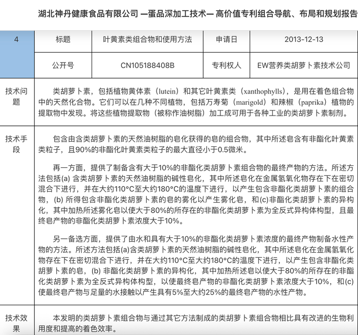 在蛋品工业中,蛋黄颜色并非完全取决于自然饲养条件。新黄河记者注意到,有专利显示,通过提高类胡萝卜素的生物利用度,可以显著提升蛋黄着色效率。