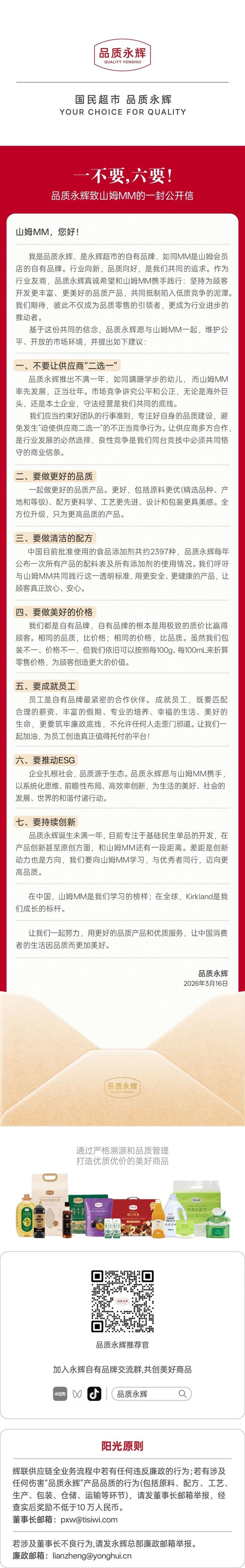 3月16日晚,永辉超市旗下自有品牌“品质永辉”向山姆会员店自有品牌 Member’s Mark(MM)发布一封公开信。公开信以“一不要、六要”为核心倡议,其中最吸引人关注的是对供应商“二选一”现象的公开反对。