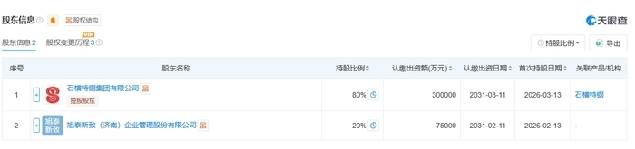 天眼查平台数据显示,山东泰山钢铁集团有限公司为泰钢控股全资子公司。泰钢控股于2026 年2月13日在济南市莱芜区完成注册,此前由旭泰新致(济南)企业管理股份有限公司以7.5亿元全资持股。随着石横特钢注资落地,泰钢控股注册资本由7.5亿元增至37.5亿元,原股东旭泰新致持股比例降至20%,控股股东同步变更为石横特钢。