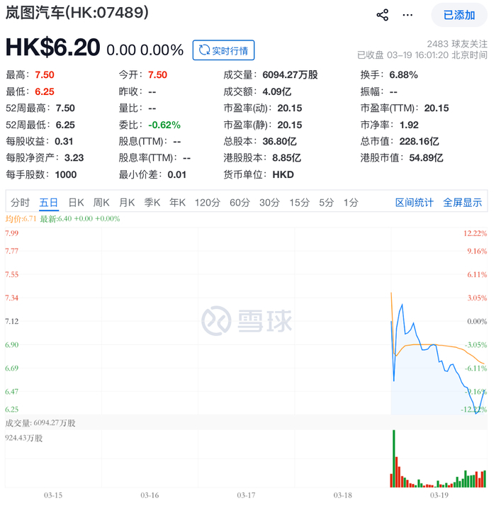 3月19日,承载东风集团新能源转型任务的岚图汽车(07489.HK)在香港联交所主板挂牌交易。作为市场口中的“央企高端新能源第一股”,其首日表现并不算亮眼。