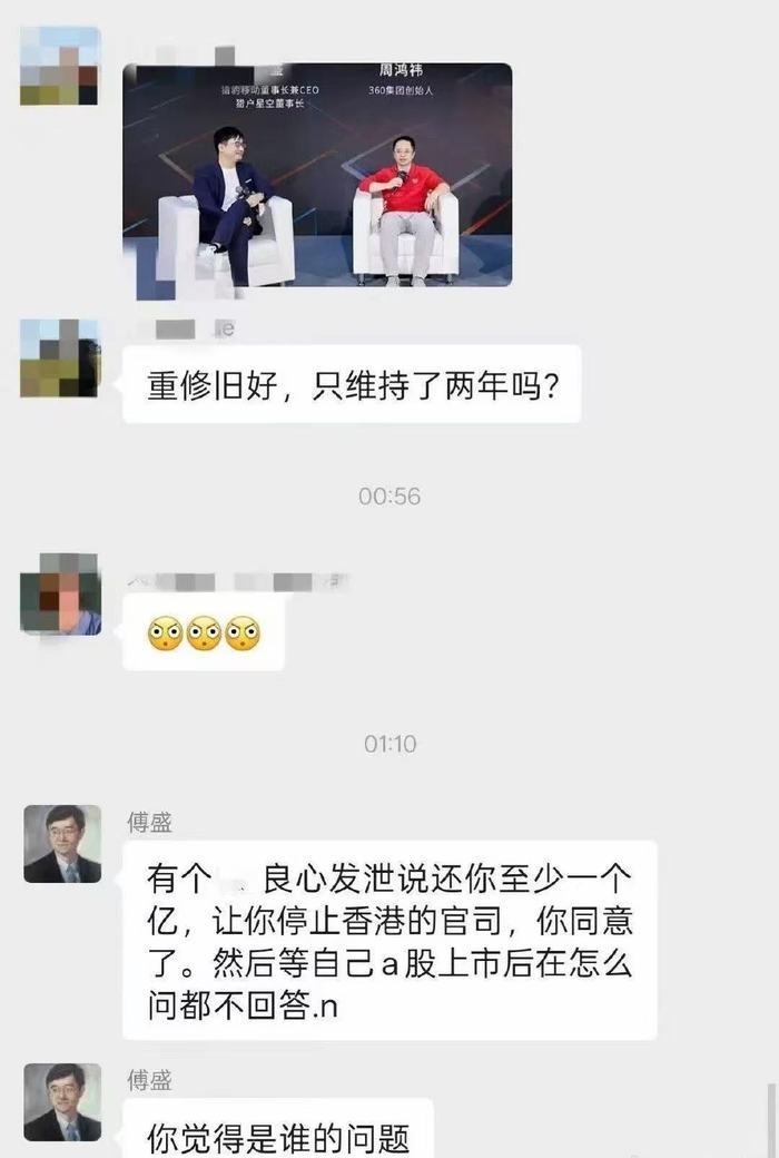 从流传的聊天截图来看,傅盛的表述较为直接,不仅指向“欠款”,提及对方曾承诺“还至少一个亿”以换取自己停止在香港的官司,并称在A股上市后对方避而不答,最终将自己拉黑。与之形成对比的是,在2024年1月的一场AI大模型发布会上,两人还曾同台互动,周鸿祎当时以“过去的事都不算事”回应过往恩怨,一度被外界解读为关系修复。