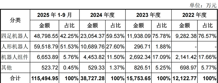 从业务结构看,公司增长的主要来源正在发生变化。2025年前三季度,人形机器人实现收入5.95亿元,占主营业务收入的51.53%;四足机器人收入为4.88亿元,占比42.25%。人形机器人已成为第一大收入来源。