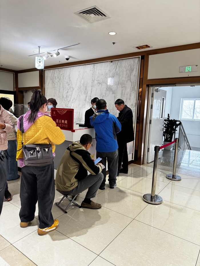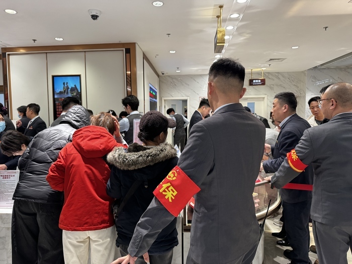为维持秩序,菜百方面临时增派保安,并在部分区域拉起隔离线。站在换票和首次下单柜台交界处的保安庞国春,除了分流顾客,还要不断为初次到场的投资者指路,解释业务流程。