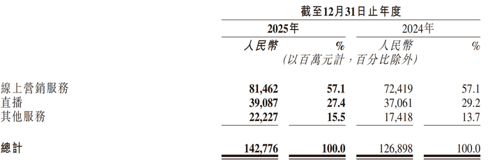 作为快手的起家基石,直播业务在过去两年的维度下近乎处于“横盘”状态。数据显示,快手2025年的直播收入为390.87亿元,虽然较2024年同比增长5.5%,但对比2023年的390.54亿元,其规模实际上回到了两年前的水平。其收入占比也从2023年的34.4%一路滑落至27.4%。