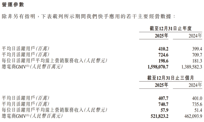 用户侧的变化进一步佐证了增长的压力。2025年快手应用的平均日活跃用户(DAU)为4.10亿,较2024年的3.99亿仅增长了2.7%左右。在用户规模逼近行业红利天花板后,平台更多依赖于对存量用户的深度运营来支撑变现,流量获取与转化的性价比正接近临界点。