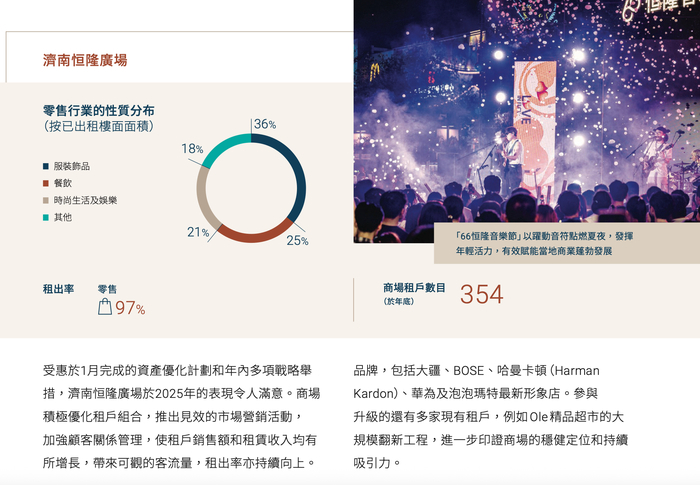 在一系列调整中,济南恒隆广场成为少数实现修复的项目。2025年该项目收入3.23亿元人民币,同比增长2%;租户销售额增长6%,出租率由93%回升至97%。