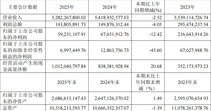 从更长周期来看,公司营收已连续三年下滑。2023年至2025年,营业收入分别为55.39亿元、54.19亿元和52.82亿元,规模持续收缩。