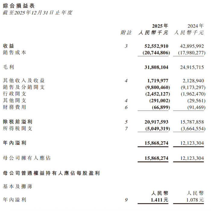 不过,凭借极深的产品护城河,农夫山泉在2025年实现了较为明显的恢复性增长。公司全年收入达到525.53亿元,同比增长22.5%;净利润158.68亿元,同比增长30.9%。从数据表现看,其不仅实现规模扩张,同时利润增速快于收入,反映出经营质量的同步改善。