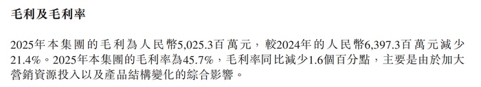 华润饮料则呈现出另一种路径。2025年公司毛利率下降至45.7%,同比减少1.6个百分点,同时销售及分销开支维持在较高水平。在收入下滑的情况下,费用刚性使利润端承压更加明显。