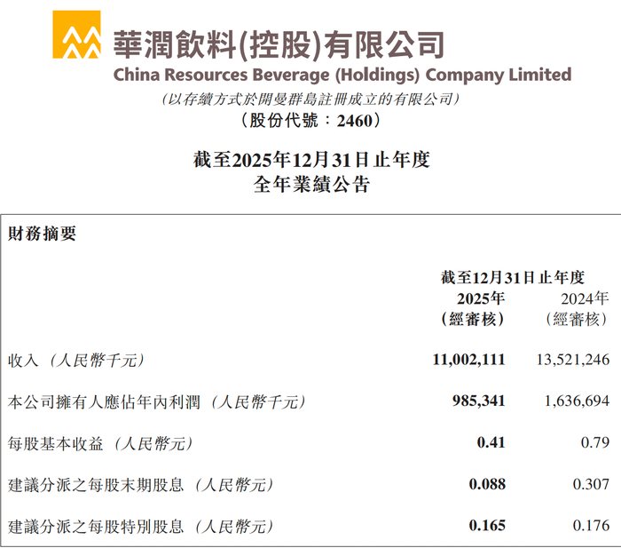 华润饮料呈现出更明显的调整态势。2025年公司收入由2024年的135.21亿元下降至110.02亿元,同比下滑18.6%;净利润由16.37亿元降至约9.85亿元,降幅接近四成。从收入与利润同步下行的表现来看,其当前阶段不仅面临需求侧压力,也反映出渠道与产品体系在竞争中的承压状态。
