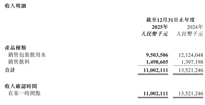 华润饮料的结构则相对集中。2025年其包装饮用水收入为95.04亿元,占总收入的86.4%,而饮料业务收入约14.99亿元,占比仅13.6%。当核心水业务同比下降21.6%时,其他品类的增长(同比约7.3%)难以形成对冲,导致整体收入出现明显回落。