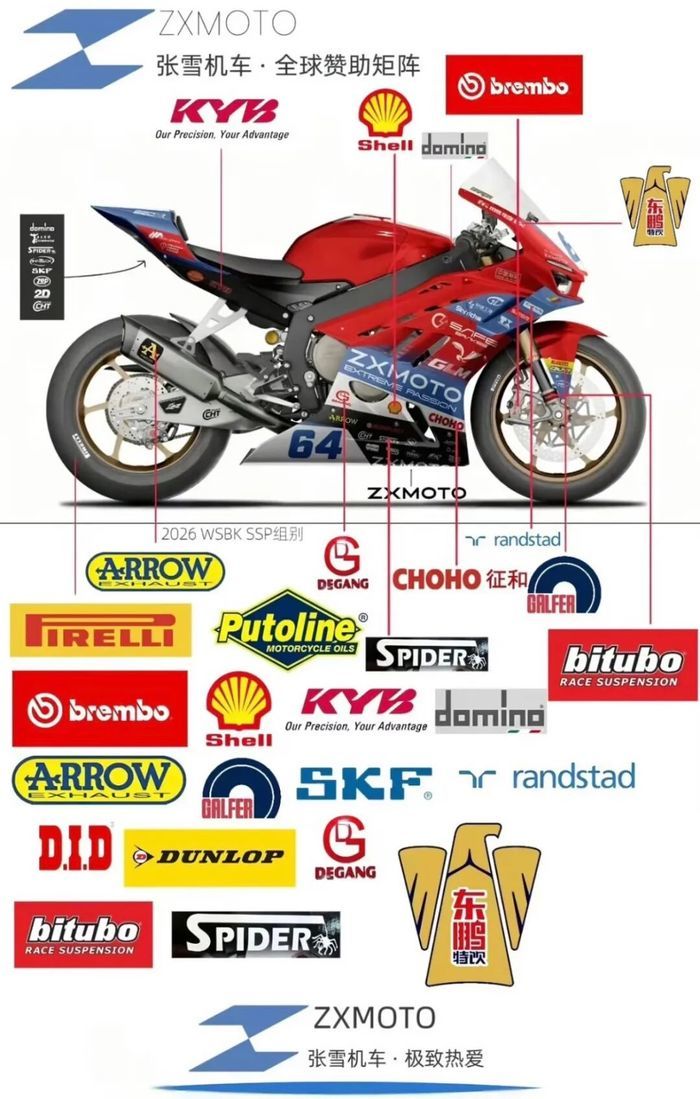 赛场之上的极致性能比拼,本质上是背后供应链体系的实力对决。此次双冠加冕的背后,是张雪机车早已搭建完成的全球化顶级供应链矩阵,为赛事战车提供了全环节的硬核支撑。新黄河记者梳理张雪机车公布的全球赞助与供应链合作矩阵发现,这台冠军战车的核心配套,几乎集齐了全球两轮赛事供应链的“天花板级”品牌:制动系统搭载常年服务MotoGP顶级厂队的布雷博Brembo,减震系统来自全球液压减震龙头KYB,排气系统由顶级赛事排气品牌Arrow专属打造,轮胎配套为WSBK官方独家轮胎供应商倍耐力PIRELLI,润滑领域牵手全球能源巨头壳牌,同时配套SKF轴承、DID链条、GALFER刹车盘、bitubo悬架等一众国际顶级配套产品,覆盖了赛车从动力、制动、传动到操控的全核心环节。