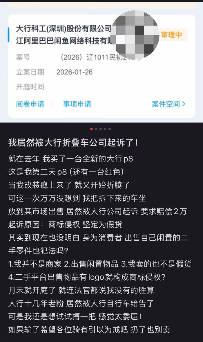 辽宁一名消费者因在闲鱼以50元转卖自行车坐垫,被折叠车品牌大行以商标侵权为由起诉,索赔金额达到2万元。该消费者告诉新黄河记者表示,案件将于本月27日开庭。
