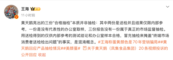 4月6日傍晚,王海团队发布长文回应。争论的重心由此发生了偏移:从“有没有添加”“合不合规”,转向了另一个问题——在允许使用的前提下,经营者是否应当向消费者说明?