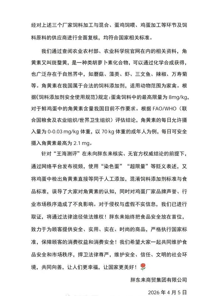 胖东来据此认定产品合规,并指责王海团队在没有官方权威结论的前提下,使用“染色蛋”等表述,混淆了饲料添加剂标准与食品标准,误导公众。目前胖东来已取证,准备通过法律途径维权。