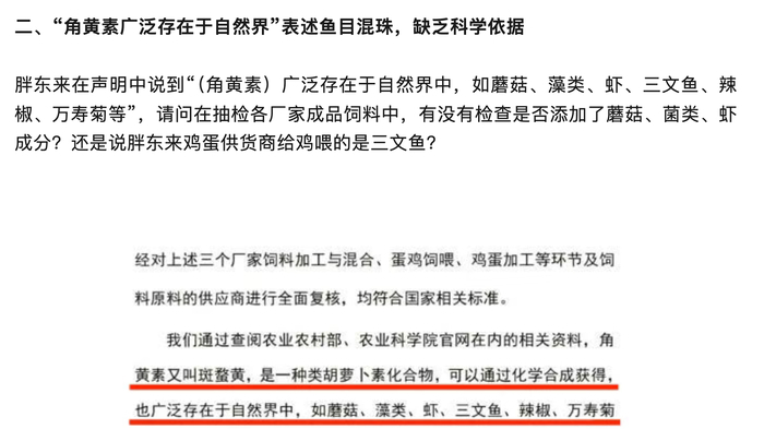 王海团队对此提出疑问:如果强调天然来源,胖东来能否在抽检的厂家饲料中找到添加蘑菇或三文鱼的证据?另外,万寿菊和辣椒提取物本身并不含角黄素,用“自然界存在”来为工业饲料中的人工合成添加剂背书,在科学上站不住脚。打假团队还提到,同为涉事品牌的德青源此前已明确承认了添加事实,而作为强调专业选品的商超,胖东来却依然试图用天然物种来混淆概念。