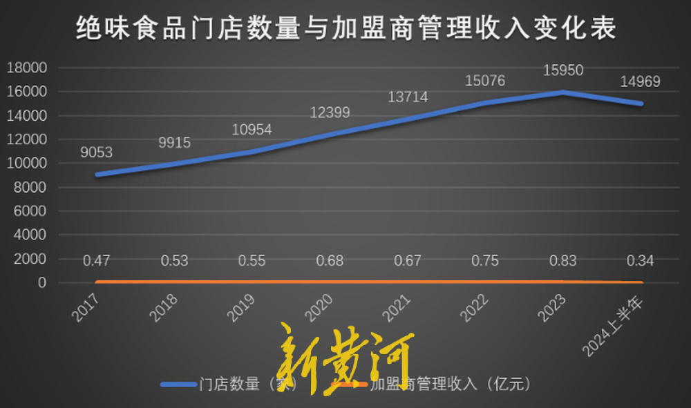 2017年,绝味食品的门店数量正式突破10000家,38亿元的年营收帮助自身成功上市。到2024年时,绝味食品的门店数已经接近15000家,同样作为卤味三巨头的周黑鸭和煌上煌门店数量加起来还不及绝味食品的一半,大街小巷有关绝味鸭脖的招牌几乎随处可见。