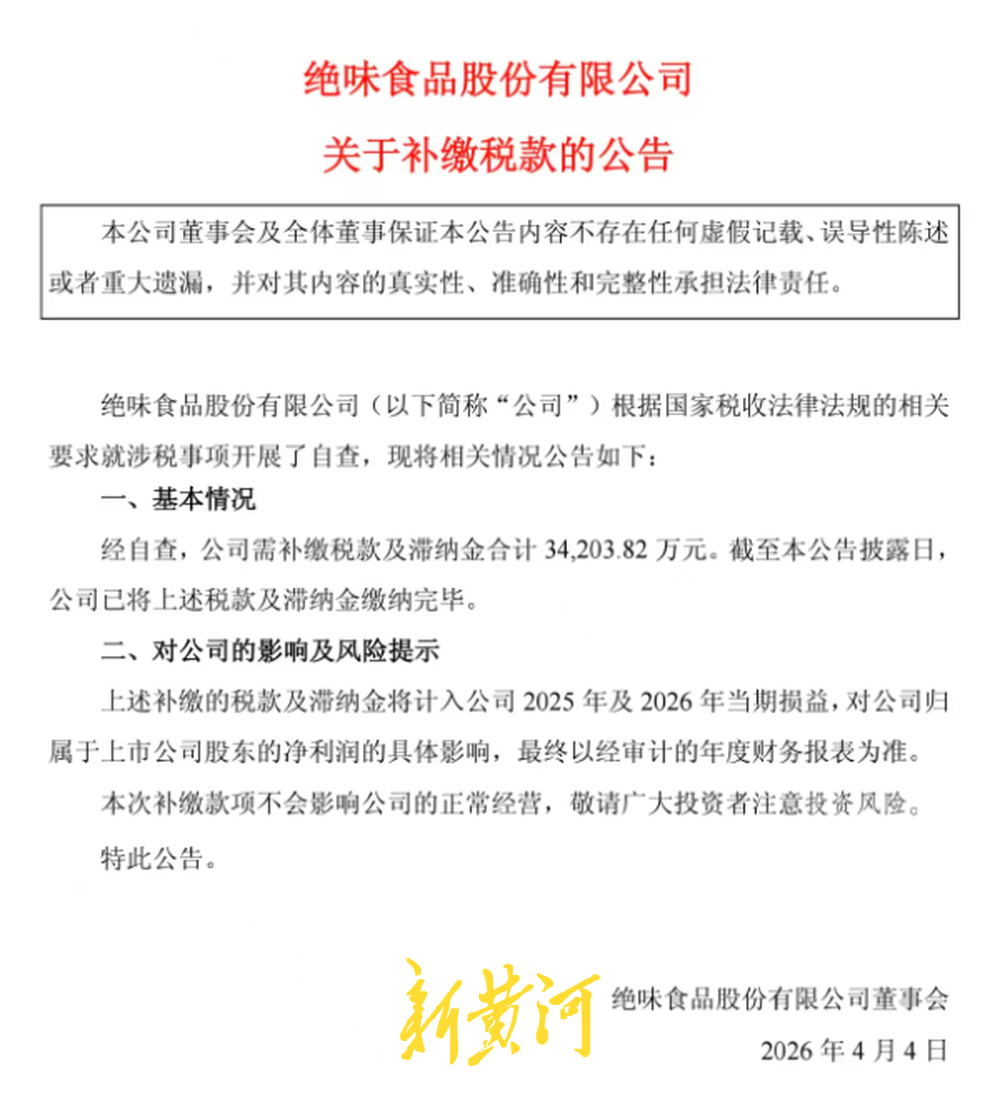 业内专家表示,与传统财务造假不同,ST绝味属于“反向造假”,即通过隐匿收入而非虚增利润,反映出公司内部管理失控。绝味食品的账外经营行为,完整覆盖了 “隐匿收入—虚假申报—少缴税款” 的偷税全链条,是主观故意的税收违法行为。值得注意的是,此次3.42亿元税款及滞纳金补缴,可谓压垮业绩的重要砝码,这笔巨额支出将分摊计入2025与2026年损益,进一步锁定公司全年亏损格局。