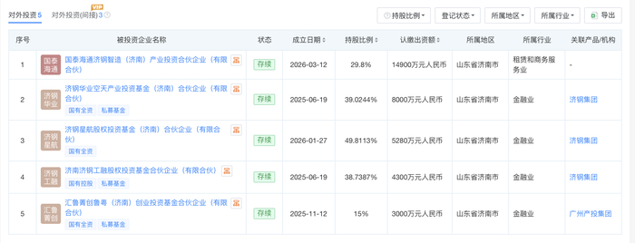 作为此次新设基金的绝对主力出资方,济钢产业母基金是济钢集团产业投资集群的核心母基金平台,于2024年12月正式设立,总认缴规模达到10亿元,由济钢基金公司担任专职管理人,投资方向精准锚定空天信息、高端装备、新材料等战略性新兴产业赛道。根据天眼查平台的数据显示,截至目前,济钢产业母基金已完成对国泰海通济钢智造(济南)产业投资合伙企业(有限合伙)、济钢华业空天产业投资基金(济南)合伙企业(有限合伙)、济钢星航股权投资基金(济南)合伙企业(有限合伙)、济南济钢工融股权投资基金合伙企业(有限合伙)等6家市场主体的直接投资,产业投资版图持续扩容。同时承担基金管理职能的济钢私募基金管理(天津)有限公司,成立于2023年7月,注册资本为2000万元,是济钢集团全资控股的专业化私募基金管理平台,具备完整的产业投资、基金运营与资产管理能力,为济钢集团全链条产业投资布局提供专业支撑。