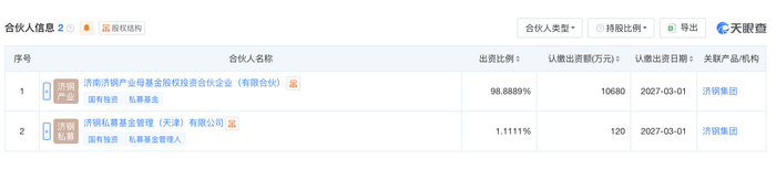 从天眼查平台的工商登记公示合伙人信息来看,济钢星通基金由两大主体联合出资设立。其中,济南济钢产业母基金股权投资合伙企业(有限合伙)(以下简称“济钢产业母基金”)为核心出资方,认缴出资额为1.068亿元,持股占比达到98.8889%;剩余1.1111%的基金份额,则由济钢私募基金管理(天津)有限公司出资120万元认购。