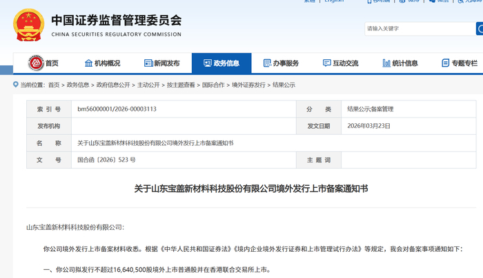 递交招股书半年多后,淄博经开区或迎首家上市公司。日前,中国证监会发布的《关于山东宝盖新材料科技股份有限公司境外发行上市备案通知书》显示,宝盖新材拟发行不超过1664.05万股境外上市普通股并在香港联合交易所上市。值得注意的是,本次发行H股尚需香港证监会、香港联合交易所等相关监管机构审批或批准,公司能否成功发行仍存在不确定性。