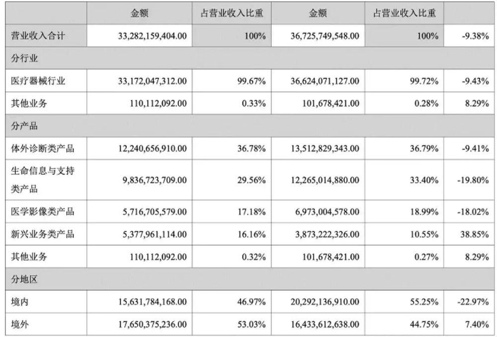 按业务看,IVD(体外诊断)收入122.41亿元,同比下降9.41%,仍是第一大业务;生命信息与支持收入98.37亿元,同比下降19.80%;医学影像收入57.17亿元,同比下降18.02%;只有新兴业务收入53.78亿元,同比增长38.85%,成为年报里最亮眼的一项。