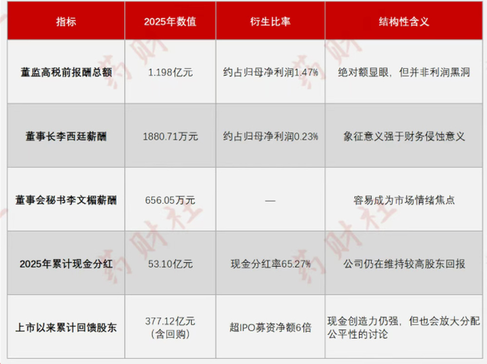 争议最大的,还是年报披露后围绕管理层薪酬展开的讨论。2025年迈瑞董监高报酬总额约1.198亿元,虽然较上一年已有下降,但在净利润同比大降30%的背景下,仍显得十分刺眼。其中,董事长李西廷年薪超过1800万元,董事会秘书李文楣年薪656.05万元,依旧处在A股董秘薪酬前列。